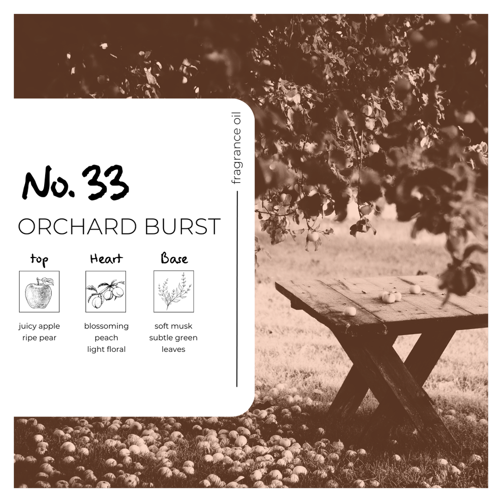 Orchard Burst Fragrance Oil captures the vibrant scent of ripe fruit freshly picked from a sun-drenched orchard. This playful blend combines juicy apple, succulent pear, soft peach blossom, and gentle musk to deliver an irresistibly fresh and cheerful aroma. Ideal for candles, soaps, diffusers, and bath products, it brings a bright, fruity sweetness that energises the senses and adds a burst of nature’s freshness to every creation.