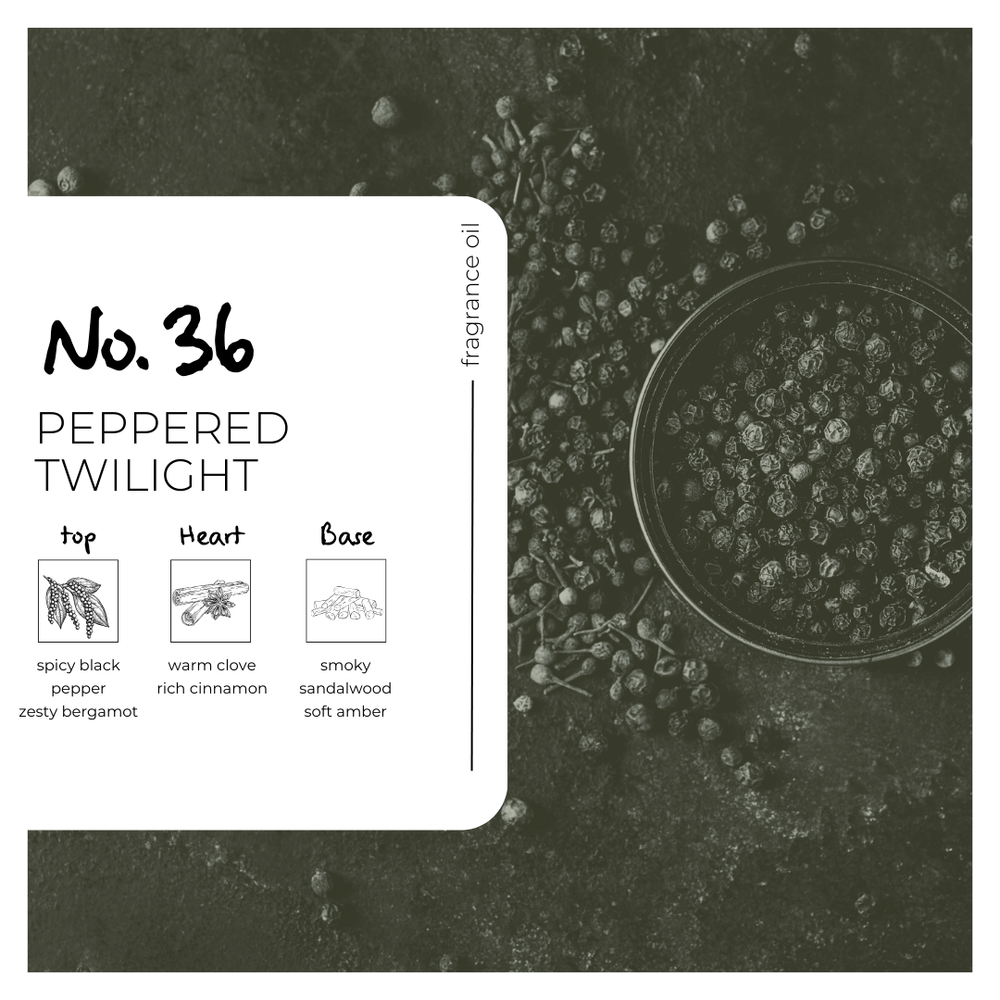 Peppered Twilight Fragrance Oil captures the mystery and warmth of twilight through a captivating fusion of spice and wood. With top notes of black pepper and bergamot, a heart of clove and cinnamon, and a base of smoky sandalwood and amber, this fragrance brings depth and intrigue to any creation. Perfect for candles, soaps, diffusers, and bath products, it’s a sophisticated scent that evokes comfort, warmth, and understated luxury.