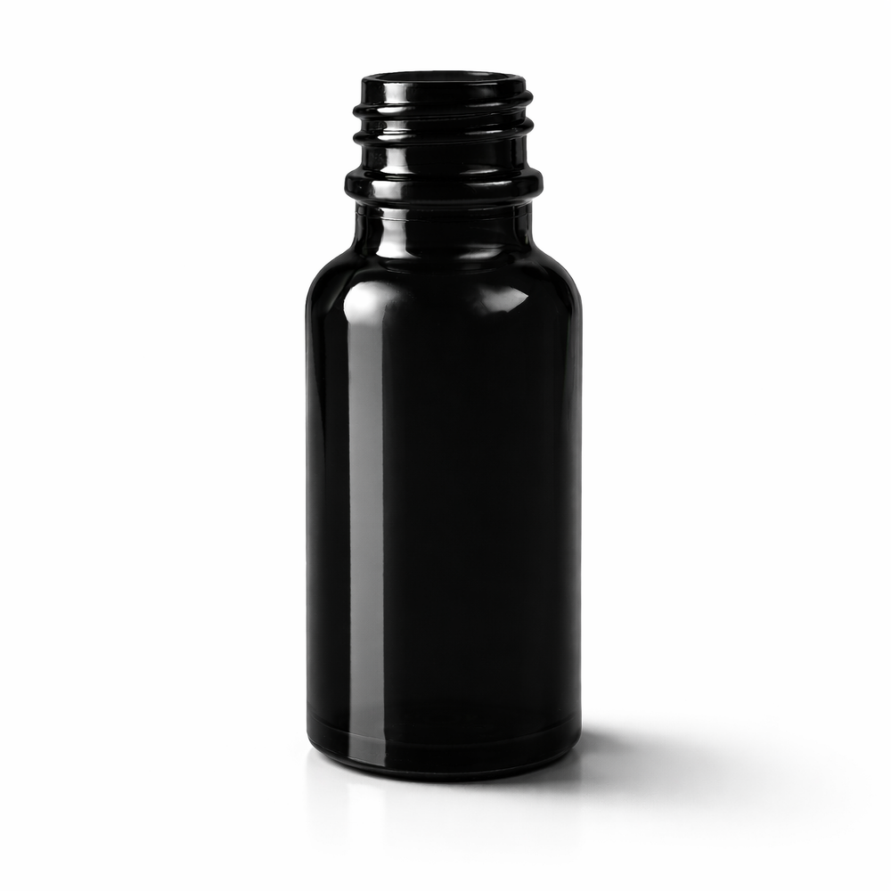A 20ml black glass dropper bottle with an 18mm neck, providing UV protection and durable storage for essential oils, tinctures, and serums.