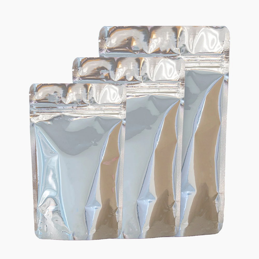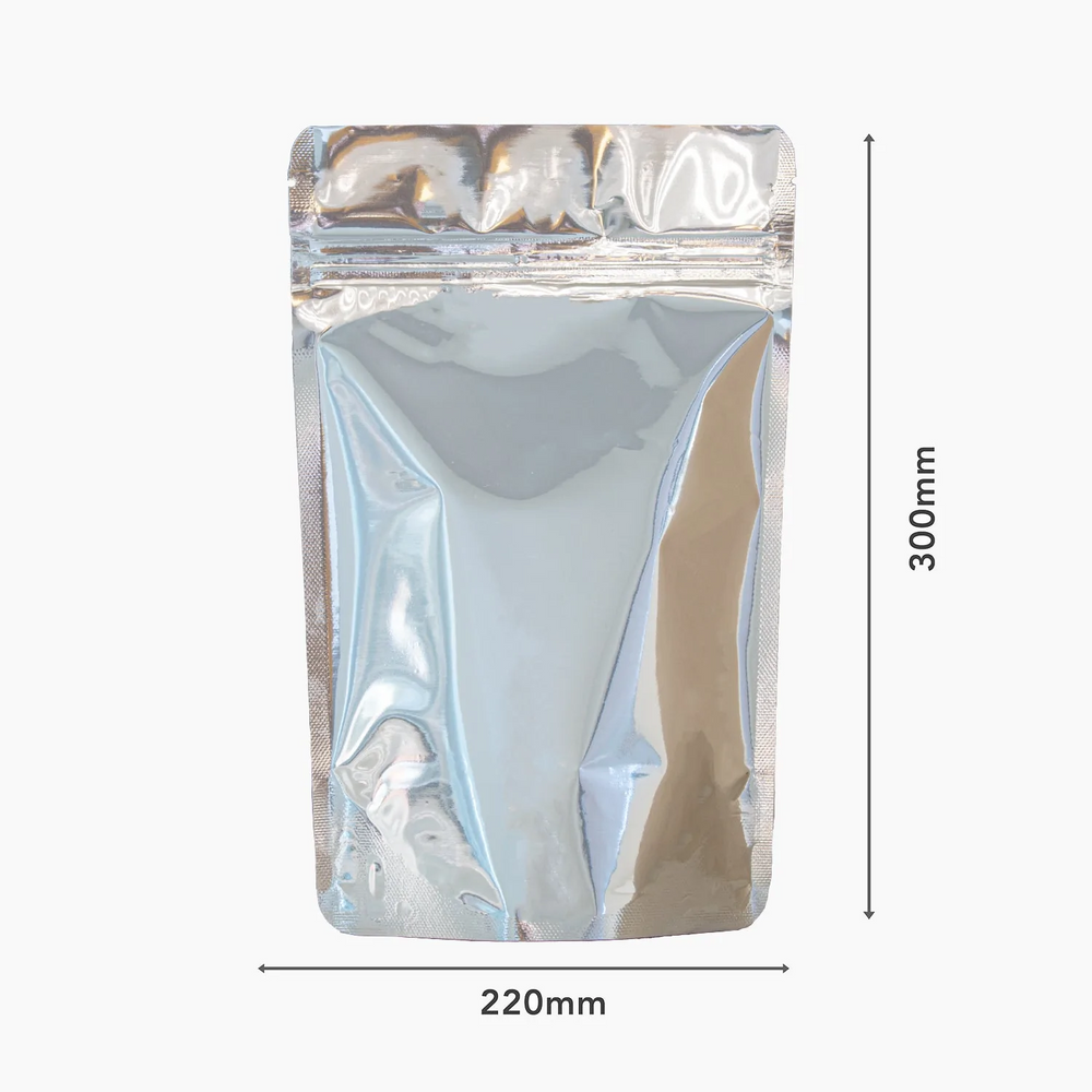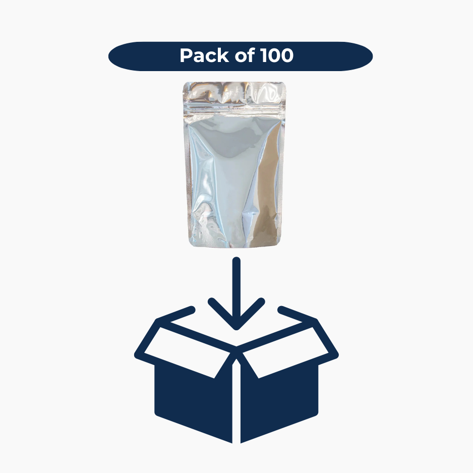 These 2000ml Metallic Stand-Up Pouches with a zipper closure offer a premium packaging option for large quantities of products. The metallic exterior provides superior protection against light, moisture, and oxygen, preserving product freshness. Ideal for food items, powders, and other bulk products requiring durable, long-term storage. These pouches are Solid Silver in colour for maximum protection from UV rays and outside.