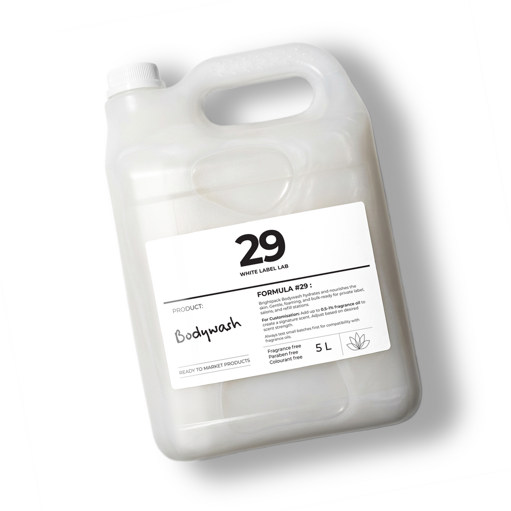 Brightpack Body Wash #29 (White Label Lab) is a luxurious, skin-loving cleanser formulated for private label brands, salons, spas, hotels, refill shops, and wholesale buyers. Designed with mild surfactants and moisturising agents, it delivers a rich, creamy lather that gently removes dirt and impurities while leaving skin soft, hydrated, and refreshed.