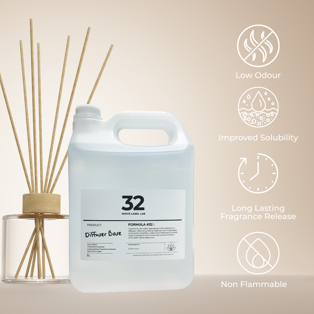 Brightpack Diffuser Base #32 is a low-odour, non-flammable base for reed and car diffusers. Blends with up to 20% fragrance oil for long-lasting scent throw and safer use.