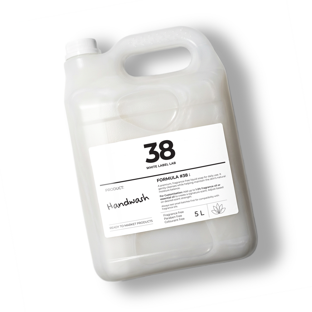 BrightPack Handwash #38 is a fragrance-free, paraben-free liquid soap base designed for private label brands, refill stations, and wholesale. Customise with 0.5–1% fragrance oil.