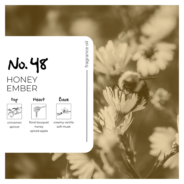 Honey Ember is a warm, golden fragrance that wraps the senses in comfort and quiet luxury. It opens with the cosy spice of cinnamon and a touch of ripe apricot, leading into a heart of floral honey and gently simmered spiced apple. The base is soft and indulgent, blending creamy vanilla with delicate musks. Rich yet wearable, this scent is perfect for autumn-inspired body care, roll-ons, and ambient home fragrances.